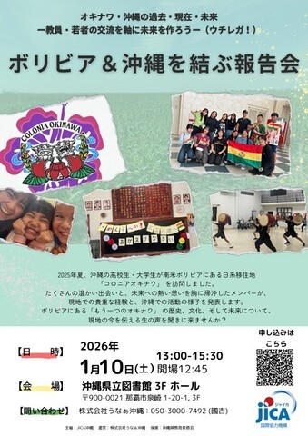 JICA沖縄主催、うなぁ沖縄の運営で行っているボリビア派遣事業(通称ウチレガ!)の最終成果報告会について、会員の皆様にご案内いたします。